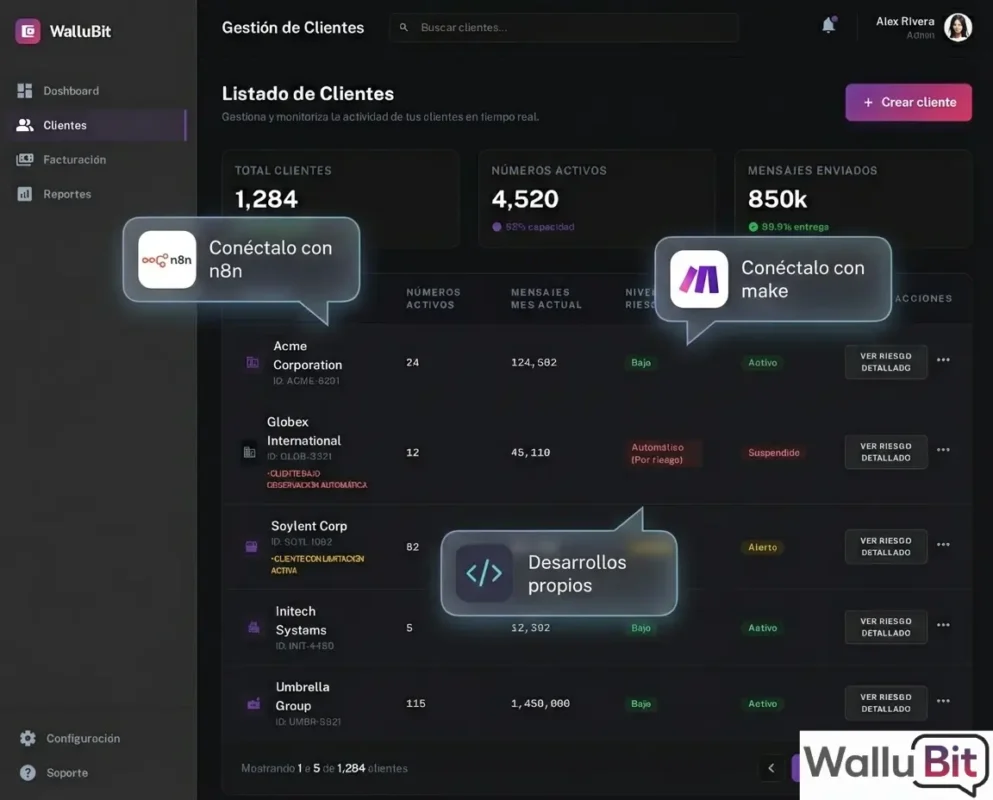 Administra tus números y clientes con herramientas de control de estado, monitoreo de actividad, métricas agregadas y límites configurables por cuenta.